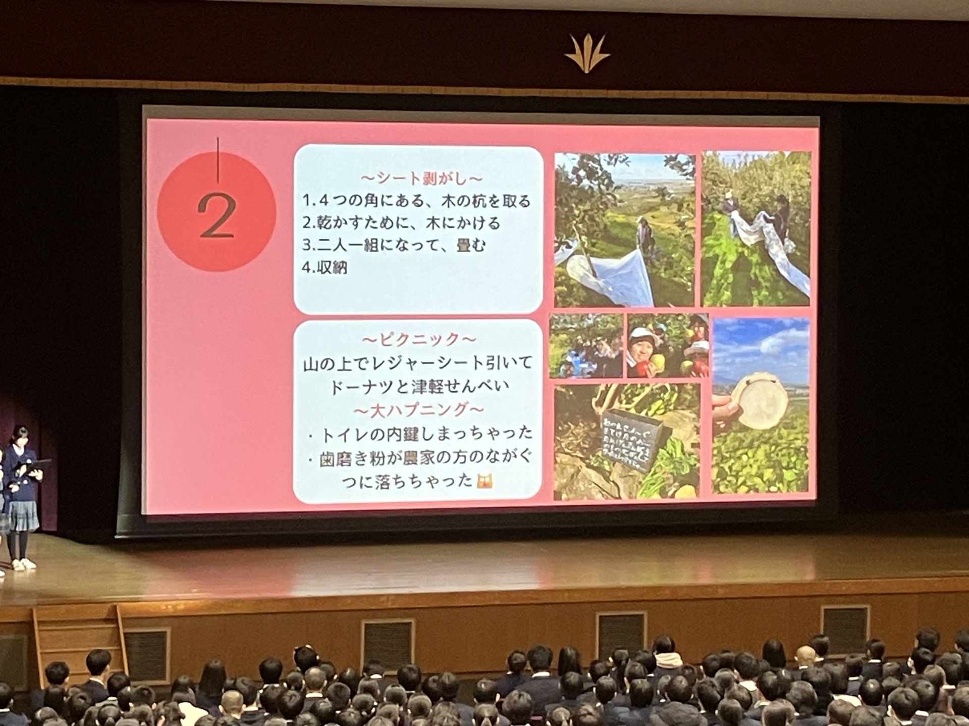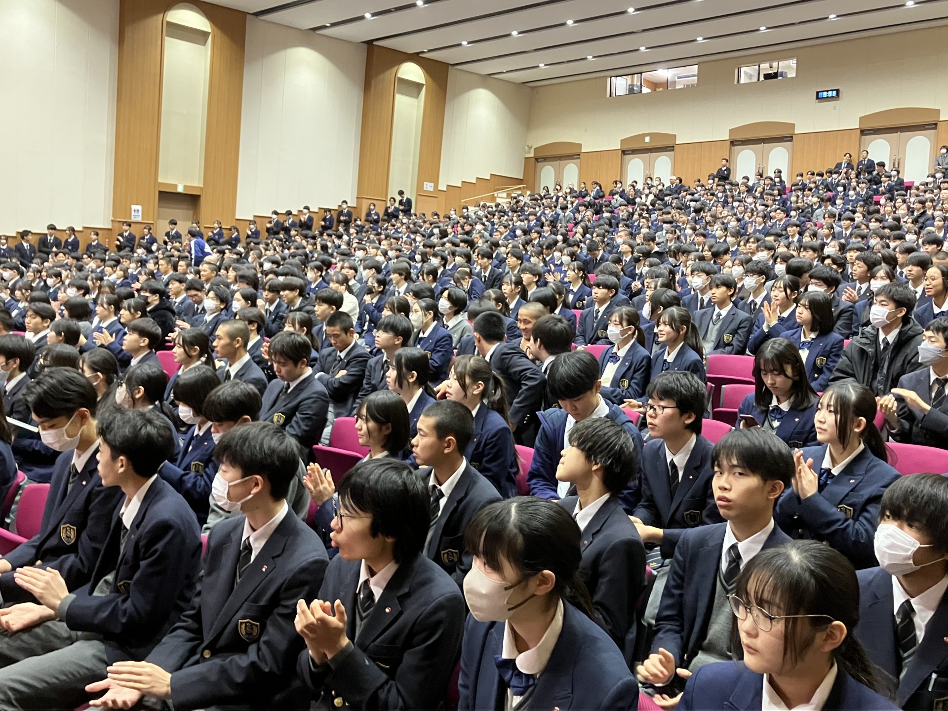 12月22日(月)、113日という長い第2学期を締めくくる終業式が行われました。各クラブの大会、文芸コンクール、各種検定などで素晴らしい成果を収めた生徒の表彰式に続き、青森フィールドワークの活動報告がありました。谷校長は2学期を振り返りつつ、詩人・俵万智さんの歌を紹介し、自分を支えてくれる方々への感謝の心を大切にして、冬休みを無事故で3学期も元気に集いましょうと学園生に呼びかけました。