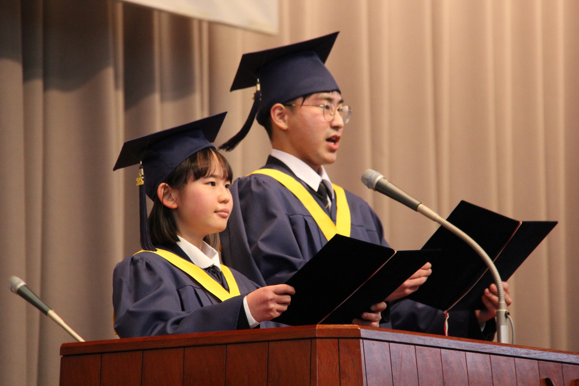 卒業式は2部構成で行われ、第1部は、校歌「草木は萌ゆる」斉唱に始まり、一人ひとりに卒業証書が授与されました。その後、谷校長の式辞や在校生代表からの「送別の言葉」、卒業生による「出発の誓い」が述べられました。続いて小島理事長より祝辞があり、最後に誓いを胸に使命を果たしていこうという決意を込めて、学園歌『負けじ魂ここにあり』を斉唱しました。