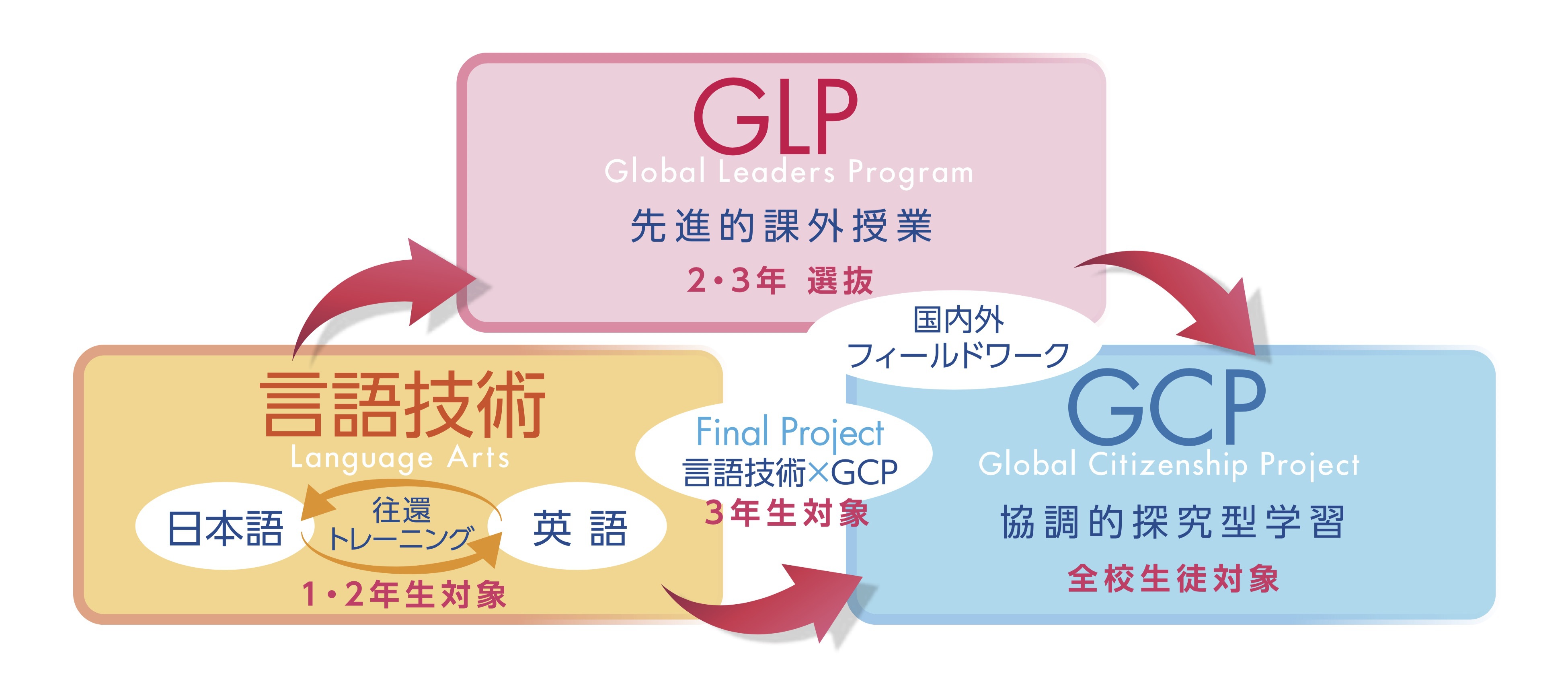 「GCP」は、全校生徒を対象とした教育プログラムです。国連が2015年に採択した「持続可能な開発のための2030アジェンダ」で示された「持続可能な開発目標(Sustainable Development Goals: SDGs)」を中心に、地球規模課題の中からテーマを設定し探究型学習に取り組みます。協働的な学びの手法を取り入れ、現代社会に対する幅広い教養を身につけるとともに、協調的問題解決力の育成を図ります。GLPと共同して、国内外でのフィールドワークも予定しています。