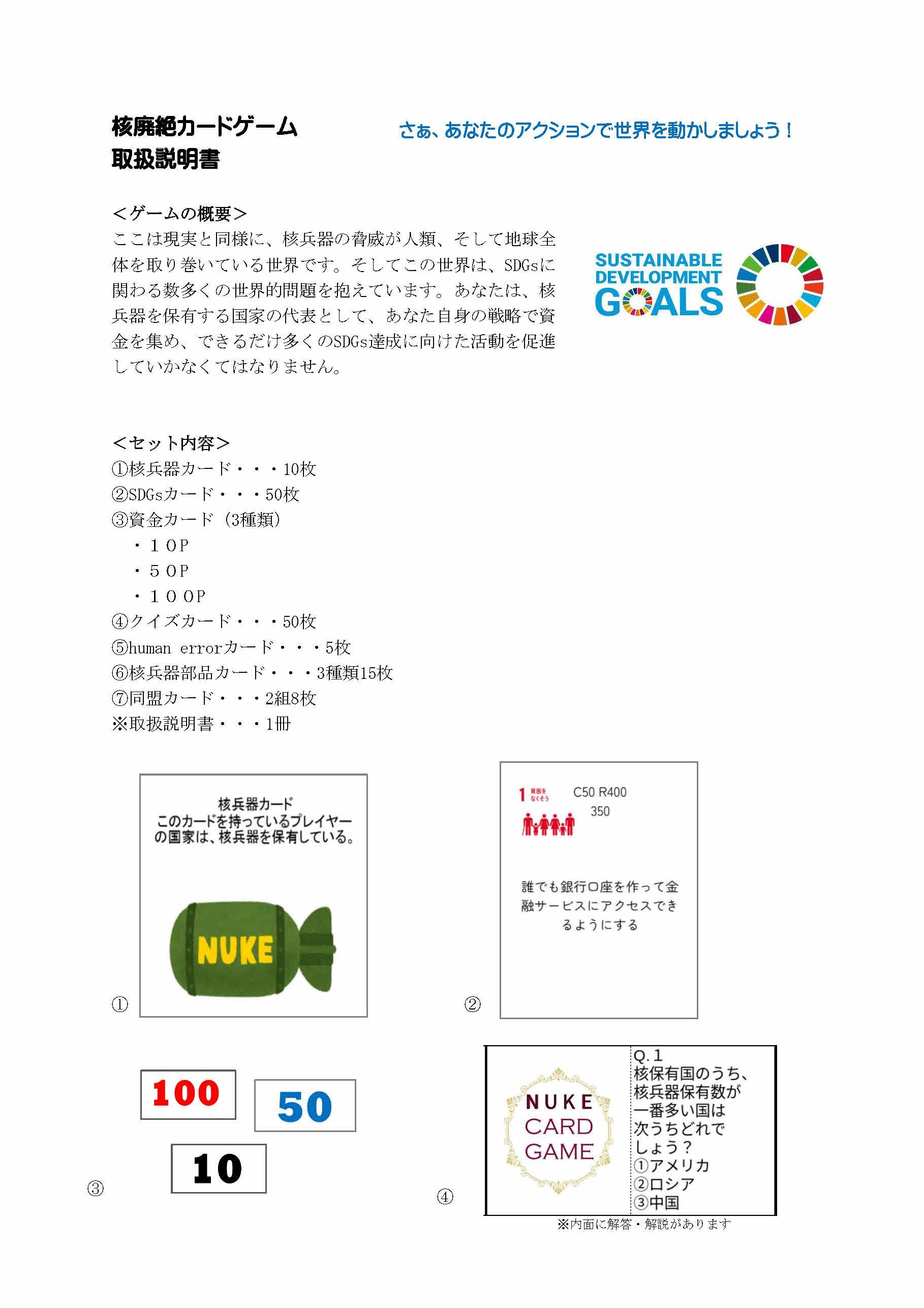 「NUKE Card Game」は、核兵器の脅威が人類、そして地球全体を取り巻いている世界を再現し、核兵器を保有する国家の代表として、戦略的に資金を集め、できるだけ多くのSDGsの達成に向けた活動を促進していくゲームです。